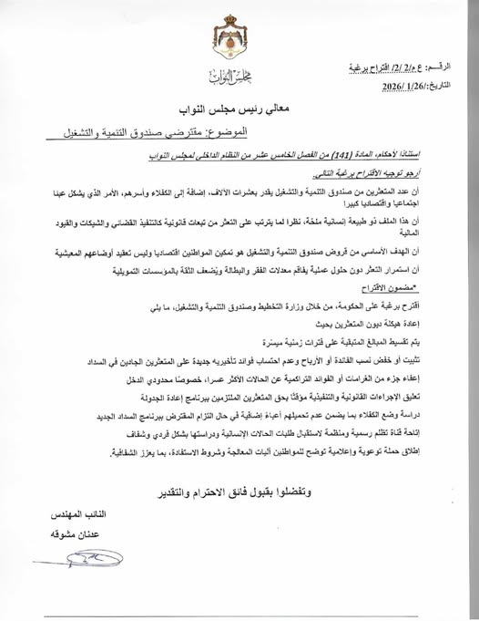 الوقائع الإخباري -قدّم النائب المهندس عدنان مشوقة اقتراحًا برغبة إلى الحكومة، دعا فيه إلى معالجة ملف المتعثرين في سداد قروض صندوق التنمية والتشغيل، مؤكدًا أن القضية باتت تشكّل عبئًا اجتماعيًا واقتصاديًا واسعًا يستدعي حلولًا عملية وعاجلة.