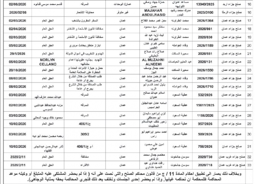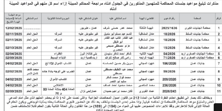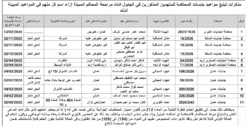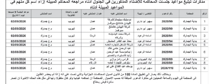 كما صدرت مذكرات تبليغ بمواعيد جلسات المحاكمة للمشتكى عليهم أمام المحاكم النظامية.