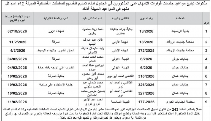 الوقائع الإخباري-صدرت اليوم الاثنين، مذكرات تبليغ تحدد مواعيد جلسات وقرارات الإمهال لتسليم المطلوبين أنفسهم إلى السلطات القضائية، وذلك وفقاً لما هو مبين لكل اسم في المواعيد المحددة، عملاً بأحكام المادة 243 من قانون أصول المحاكمات الجزائية.