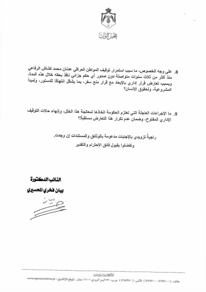 وعلى وجه الخصوص، استفسرت المحسيري عن سبب استمرار توقيف المواطن العراقي عدنان محمد كشاش الرفاعي لأكثر من ثلاث سنوات متواصلة دون صدور أي حكم جزائي نافذ بحقه، نتيجة تعارض قرار إداري بالإبعاد مع قرار منع سفر، معتبرة ذلك انتهاكًا للدستور ومبدأ المشروعية والحق في الحرية والأمان الشخصي.