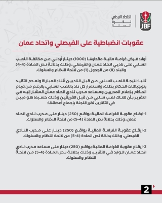 الوقائع الإخباري -قررت لجنة الانضباط والسلوك في الاتحاد الأردني لكرة السلة، اليوم الأربعاء، فرض عقوبات تأديبية على فريقي الفيصلي واتحاد عمّان نتيجة ممارسة اللعب السلبي خلال المباريات الأخيرة.