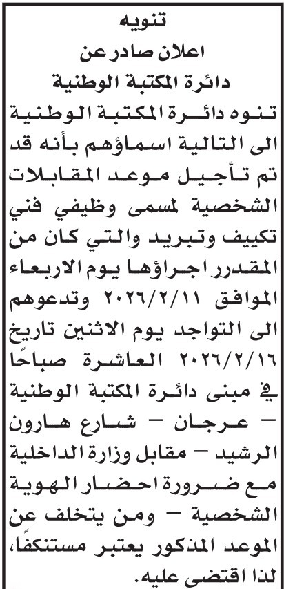 الوقائع الإخباري -تدعو دائرة المكتبة الوطنية، اليوم الاثنين التالية اسماؤهم لاجراء المقابلات الشخصية.