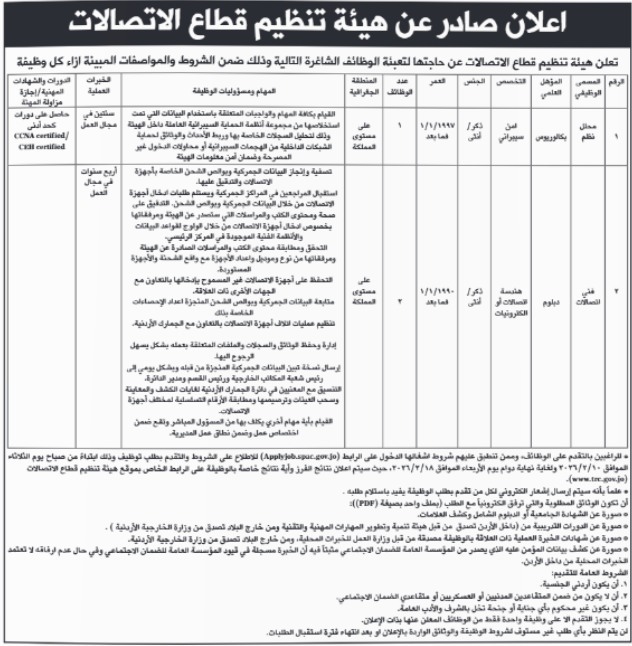 الوقائع الإخباري - اعلنت هيئة تنظيم قطاع الاتصالات اليوم الاثنين عن حاجتها لتعبئة وظائف شاغرة.