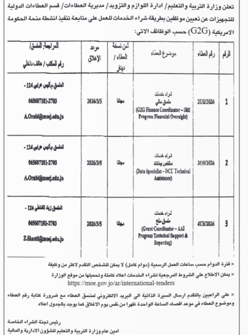 التربية تعلن عن رغبتها في شراء خدمات موظفين لشواغر متعددة