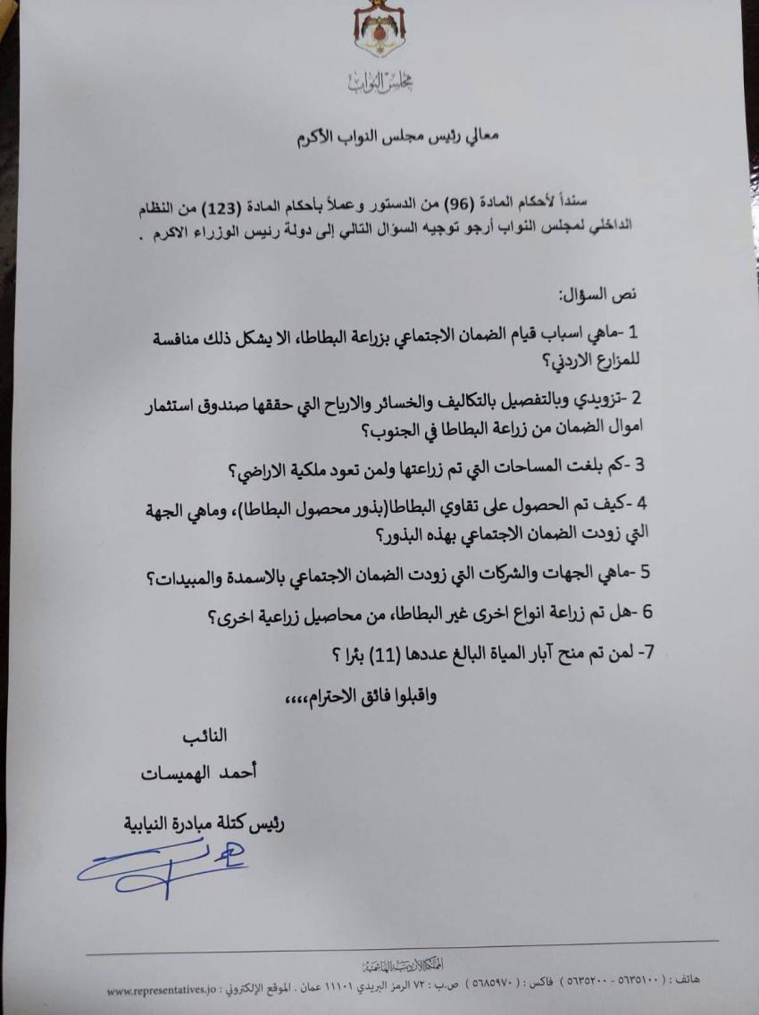 النائب أحمد الهميسات يوجه أسئلة للوزير حسان حول زراعة البطاطا من قبل مؤسسة الضمان الاجتماعي