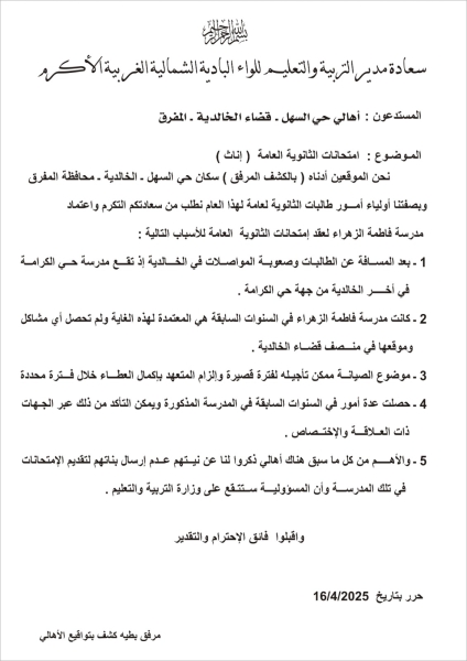 أهالي "خالدية المفرق" يناشدون لعدم نقل مركز امتحانات التوجيهي للإناث