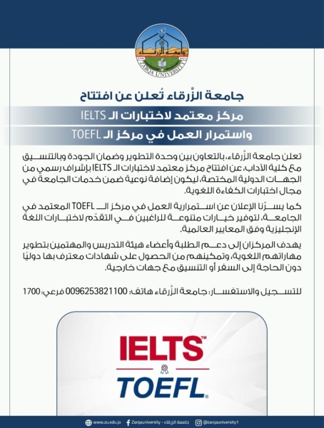 • جامعة الزرقاء تطلق مركزًا معتمدًا لاختبارات IELTS وتواصل تقديم خدمات TOEFL