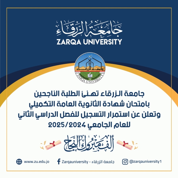 جامعة الزرقاء تهنئ الطلبة الناجحين في الثانوية العامة
