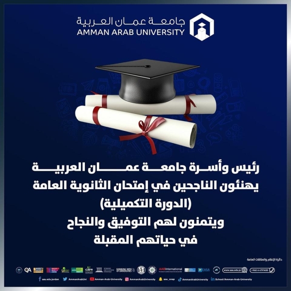 جامعة عمان العربية تهنئ الناجحون في امتحان الثانوية العامة (الدورة التكميلية)