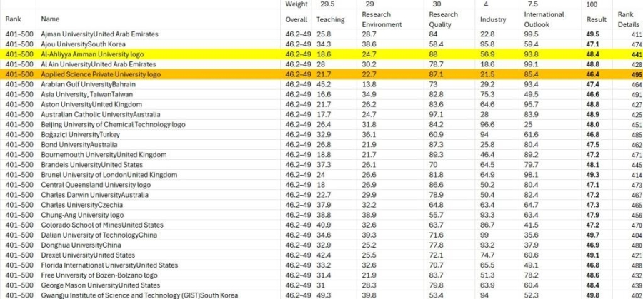 • عمان الأهلية تفوز بالمركز الأول على الجامعات الأردنية و 401 -500 عالمياً بتصنيف التايمز العالمي لعام 2026