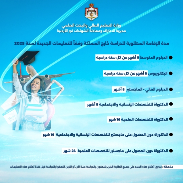 • "التعليم العالي" تطلق إنفوجرافيك لمدد الإقامة الجديدة لمعادلة الشهادات غير الأردنية