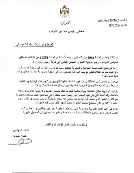 • مشوقة يسأل الحكومة عن تلوث مياه الشميساني والمساءلة وفاتورة المتضررين
