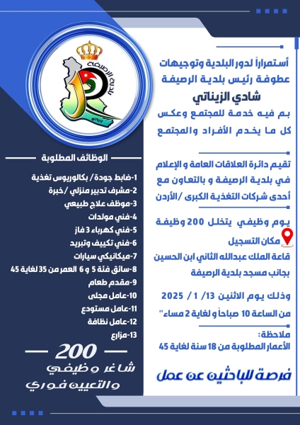 • يوم وظيفي لتوفير مئتي فرصة عمل في الرصيفة الاثنين