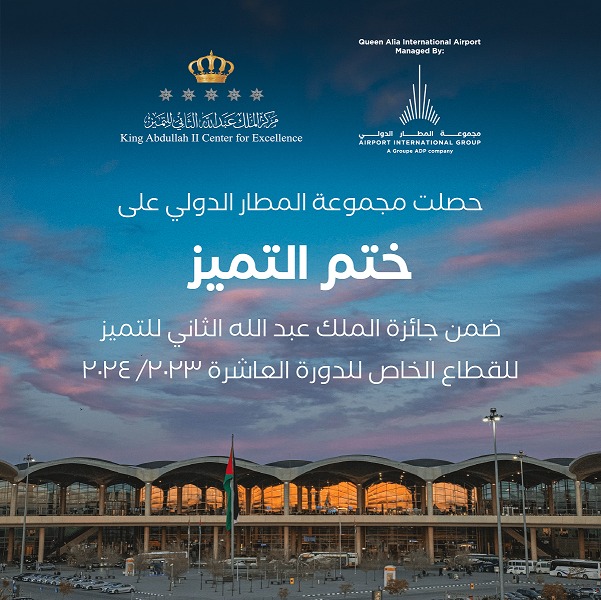 مجموعة مطار الدولي تحصل على "ختم التميّز" ضمن جائزة الملك عبدالله الثاني للتميز