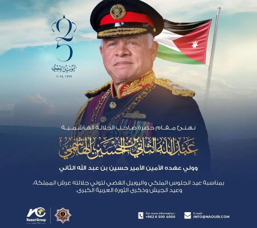 • مجموعة الناعوري تهنئ جلالة الملك بعيد الجلوس الملكي وعيد الجيش وذكرى الثورة العربية الكبرى