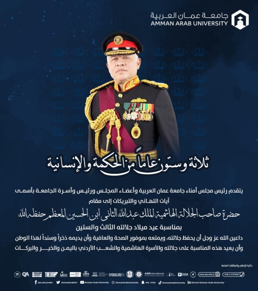 جامعة عمان العربية تهنئ بمناسبة عيد ميلاد جلالة الملك عبدالله الثاني ابن الحسين المعظم حفظه الله