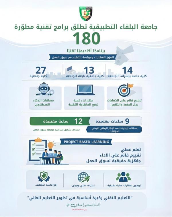 • البلقاء التطبيقية تطلق برامج تقنية مطوّرة في 27 كلية جامعية