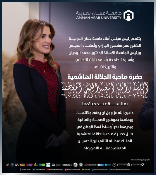 • جامعة عمان العربية تهنئ جلالة الملكة رانيا العبدالله المعظمة بمناسبة عيد ميلادها