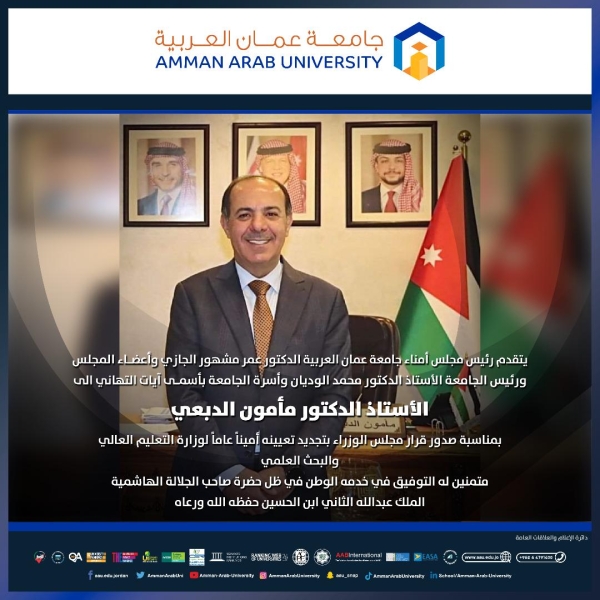 • جامعة عمان العربية تهنئ الأستاذ الدكتور مأمون الدبعي بمناسبة تجديد تعيينه أميناً عاماً لوزارة التعليم العالي