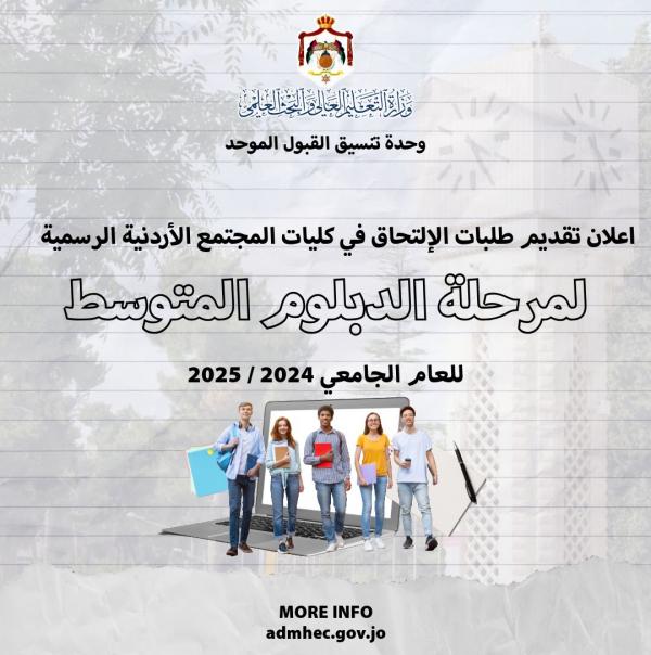 • بدء تقديم طلبات الالتحاق الإلكترونية في كليات الجامعات الرسمية لمرحلة الدبلوم المتوسط