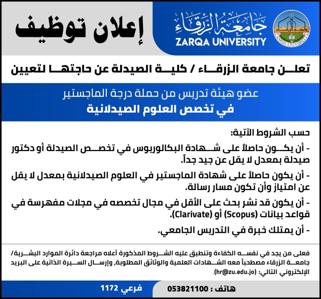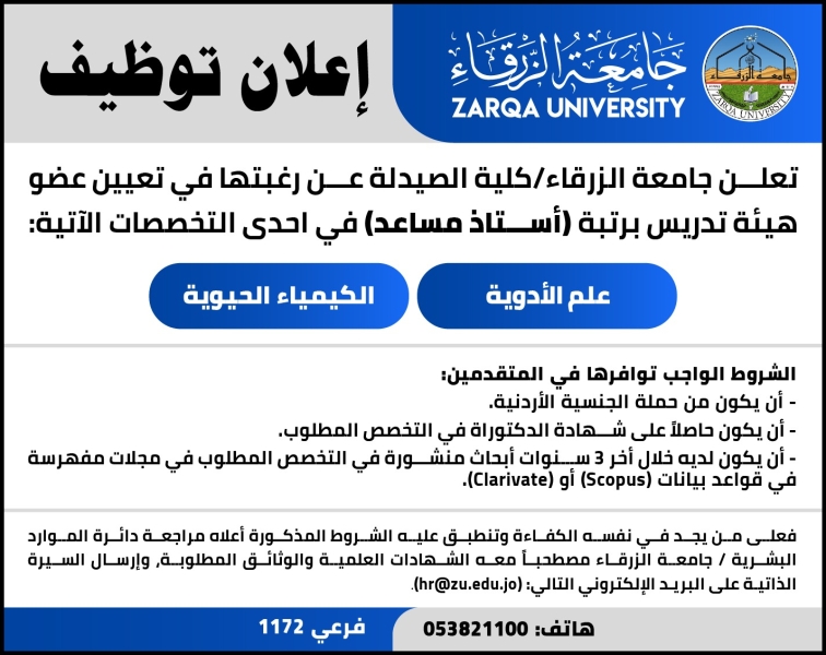 • جامعة الزرقاء تعلن عن وظائف شاغرة