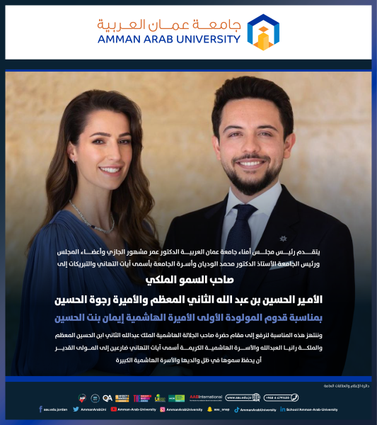 • جامعة عمان العربيـــة تهنئ ولي العهد والاميرة رجوة بقدوم "إيمان"