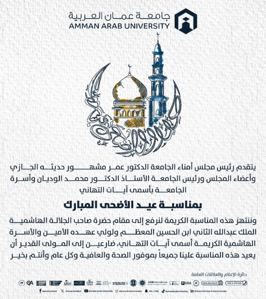 • أسرة جامعة عمان العربية تهنئ بمناسبة عيد الأضحى المبارك
