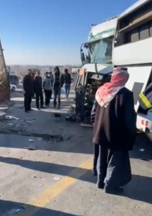 • حادث تصادم بين حافلة وتريلا يتسبب بإغلاق طريق الـ100