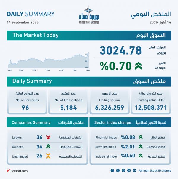 • بورصة عمّان تتخطى حاجز 3000 نقطة لأول مرة منذ 2008