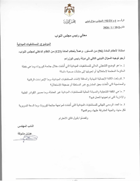 • النائب مشوقة يسأل رئيس الوزراء عن مصير المستشفيات الميدانية وكلفة إنشائها وآليات الاستفادة منها