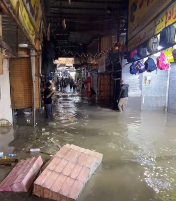 • الأمطار الغزيرة تُغرق محالاً تجارية في سوق النوفيتية بالبقعة
