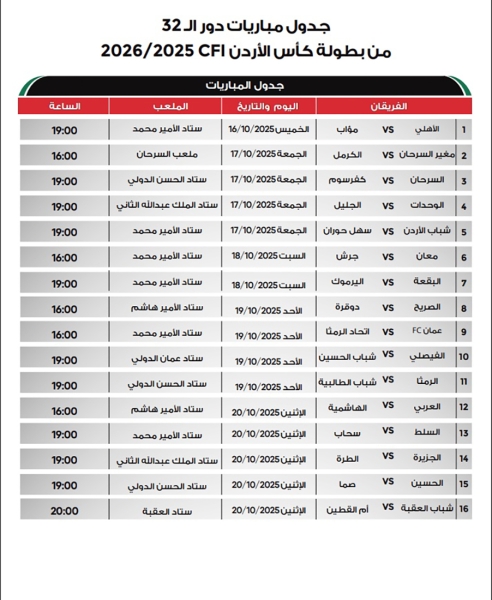 • اتحاد كرة القدم يعلن مواعيد وأماكن مباريات كأس الأردن – الدورة 32