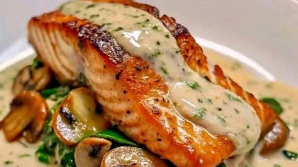 • سمك السلمون بزبدة الثوم مع السبانخ والفطر في صلصة كريمية